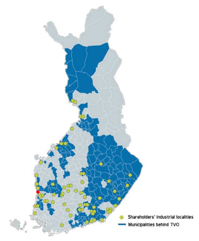 Rysunek 5. Lokalizacja podmiotów posiadających udziały w spółce TVO będącej właścicielem elektrowni Olkiluoto (na czerwono). Gminy - niebieskie obszary; zakłady przemysłowe - zielone punkty.