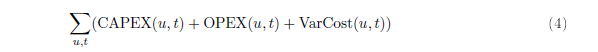 • CAPEX(u, t) = Cu,t · BWu,t oznacza koszt jednostkowy rozbudowy jednostki/magazynu u w czasie t pomnożony przez budowany wymiar jednostki/magazynu u w czasie t,