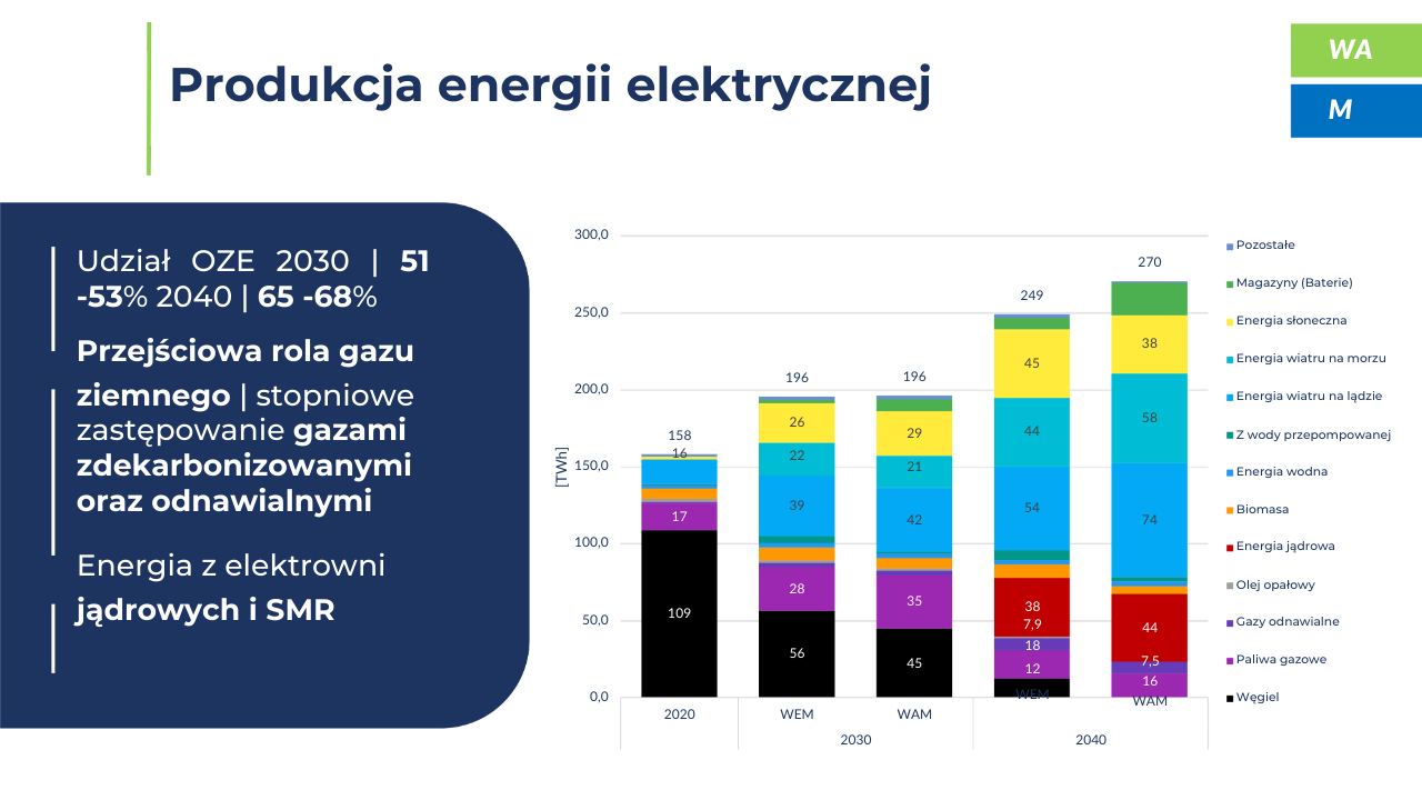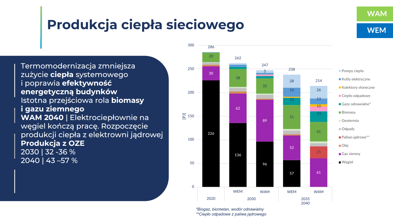 W planie zachowano dwa scenariusze: WAM, dla przyspieszonej transformacji z uwzględnieniem mechanizmów mobilizujących oraz WEM, dla zrównoważonej transformacji z wykorzystaniem obecnych już mechanizmów. Do 2030 roku udział OZE w produkcji energii elektrycznej ma wynieść - zgodnie także z wcześniejszym planem - od 51,6% (WEM) do 53,2% (WAM). W ciepłownictwie zaś udział OZE będzie mniejszy, od 32 do 36 procent.