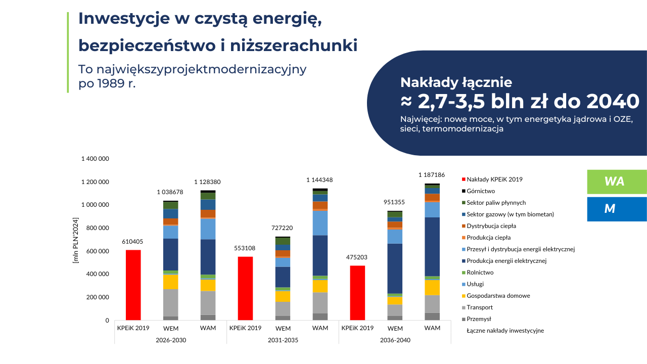 Łączne nakłady inwestycyjne w latach 2026 - 2040 wyniosą ok. 2,7 bln zł w scenariuszu WEM, do ok. 3,5 bln zł w scenariuszu WAM. Najwięcej pieniędzy ma trafić na cele modernizacyjne między innymi transportu, przesyłu i dystrybucji energii elektrycznej i na samą produkcję (nowe moce, modernizacja sieci i atom). Koszty produkcji energii elektrycznej mają spaść o 8 procent do 2030 roku i o kolejne dziesięć do 2040. Sami zaś konsumenci mają mniej płacić za energię. Najmniejsza redukcja kosztów ma wynieść 30% (WEM), największa nawet 55% (WAM) do 2040 roku, chociaż w ciągu najbliższych 5 lat tych obniżek możemy jeszcze nie odczuć.