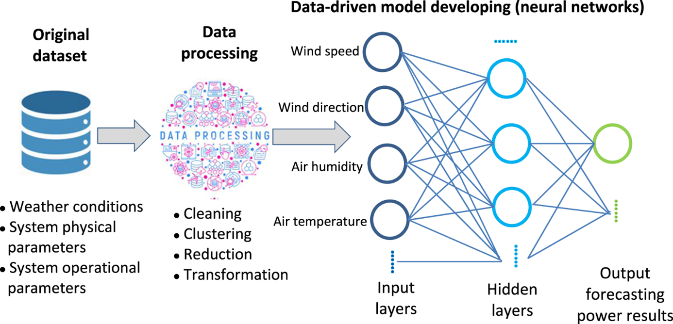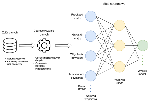 W tym celu gromadzi się prognozy pogody, fizyczne oraz operacyjne parametry wiatraków, które odpowiednio dostosowane tzn. oczyszczone z wadliwych danych oraz pogrupowane są wykorzystywane do trenowania modelu, który potem jest wykorzystywany do przewidywania generacji w czasie rzeczywistym. Ostatecznie do modelu trafiają takie informacje jak prędkość i kierunek wiatru, temperatura i wilgotność powietrza oraz fizyczne parametry turbin.